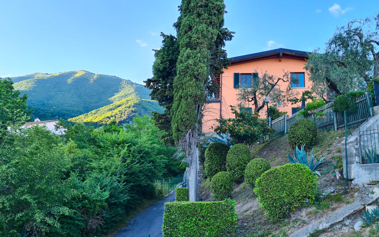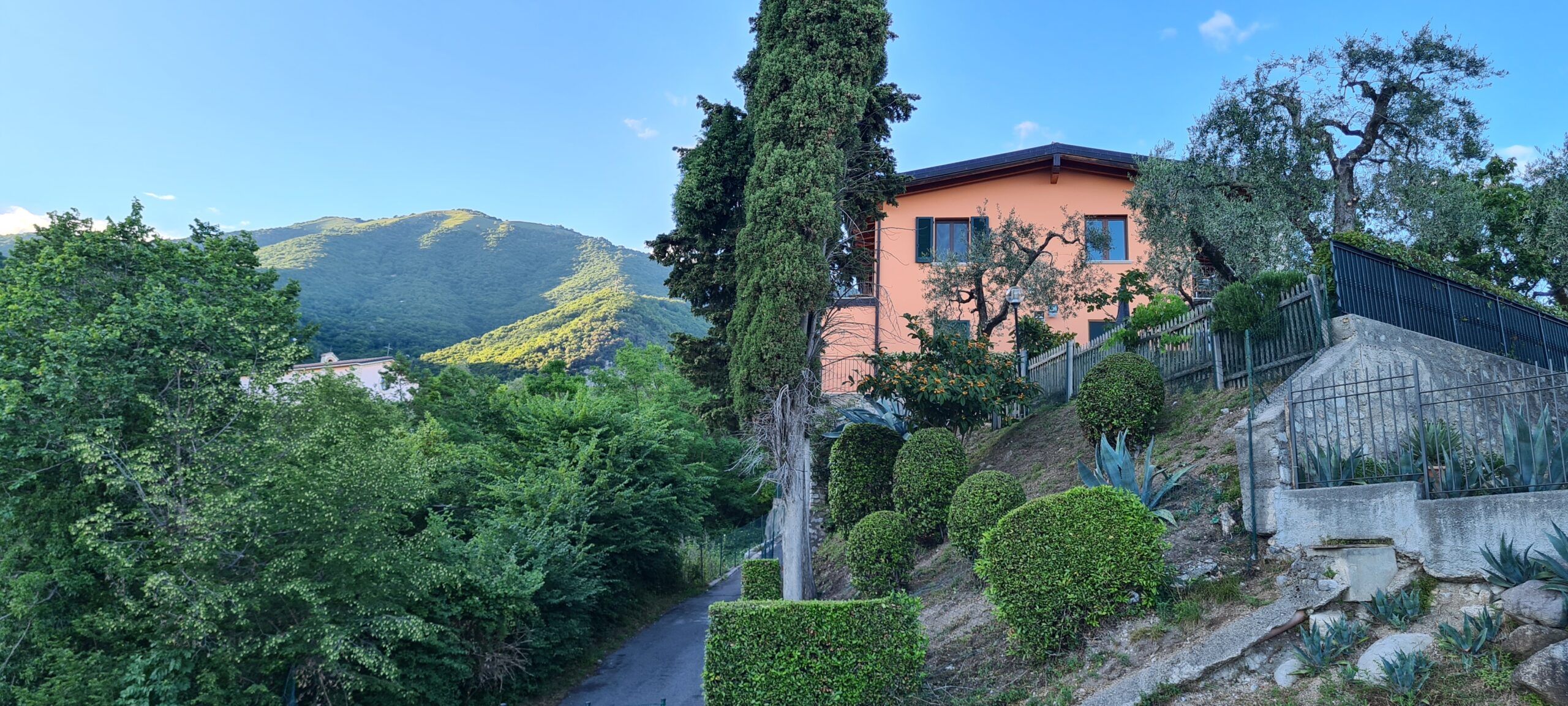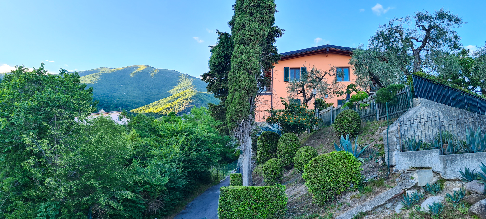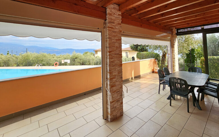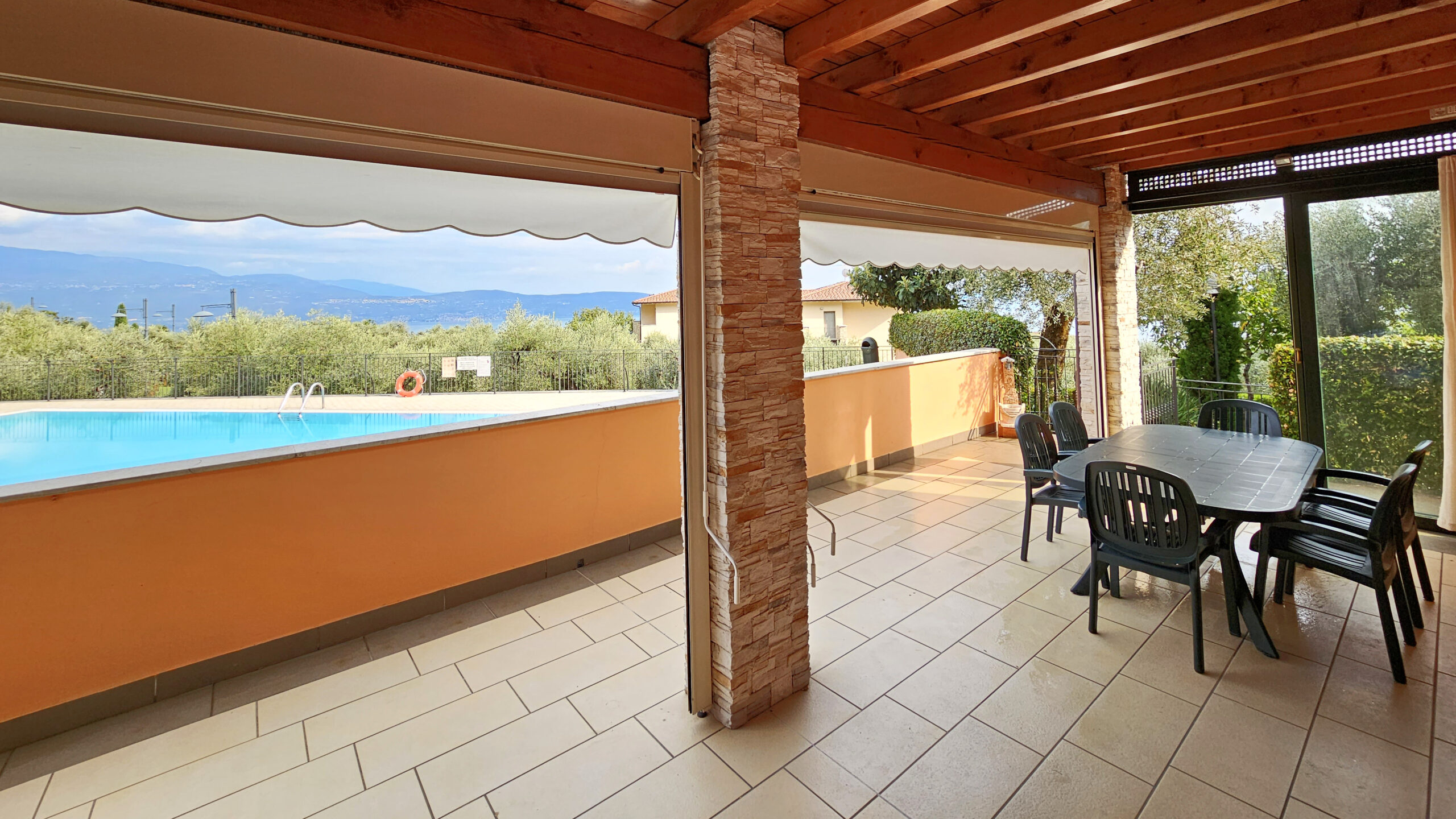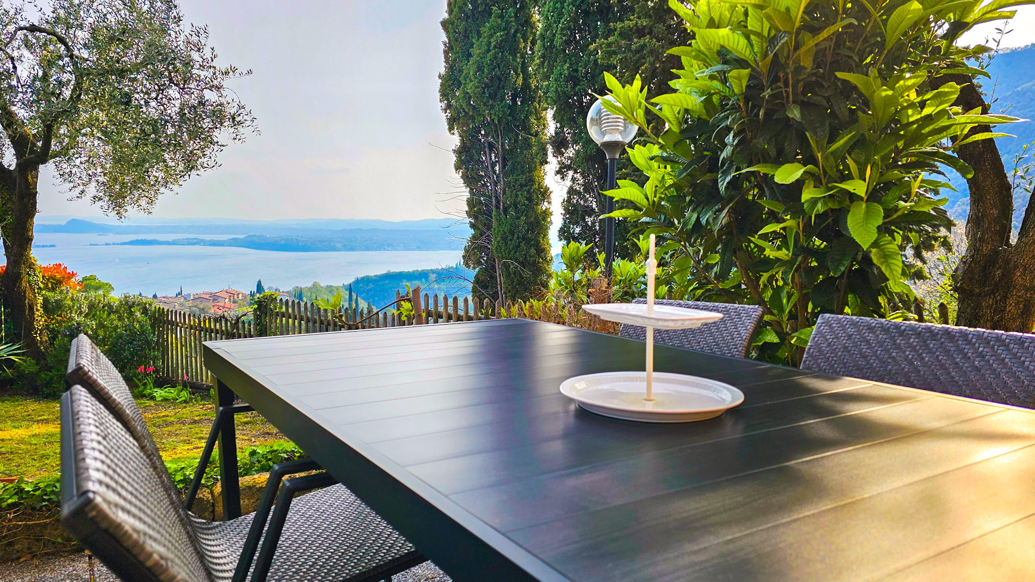 Unsere großzügige, überdachte Terrasse mit Blick auf den Monte Baldo bietet morgens Sonne und nachmittags Schatten. Von hier geht es direkt in den Garten.
