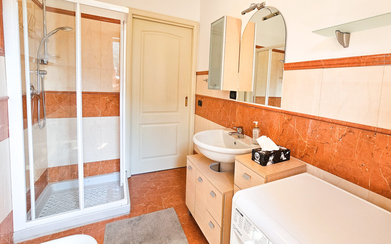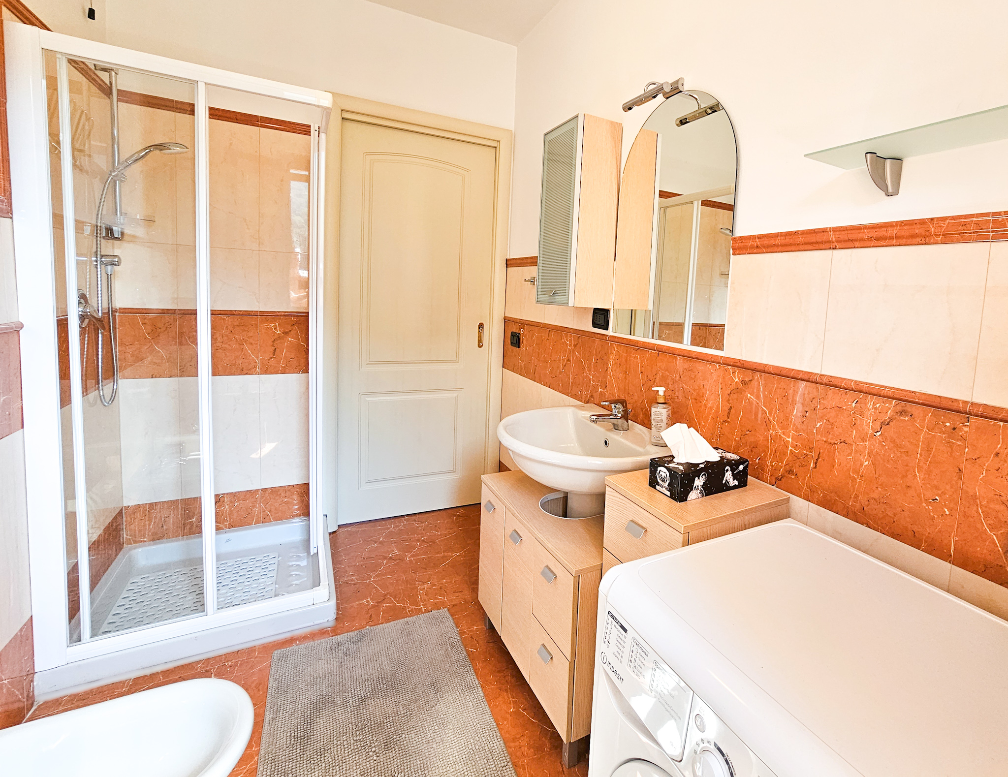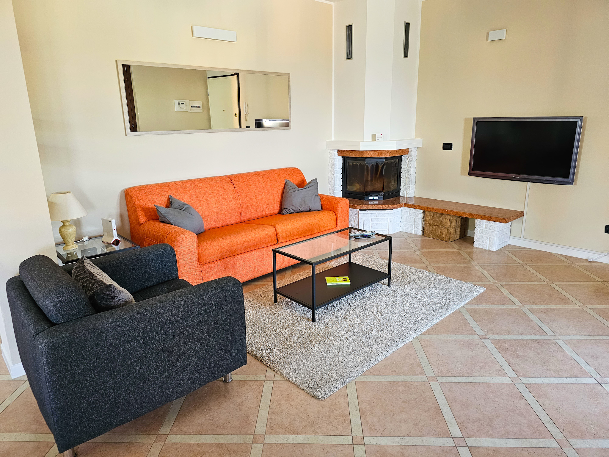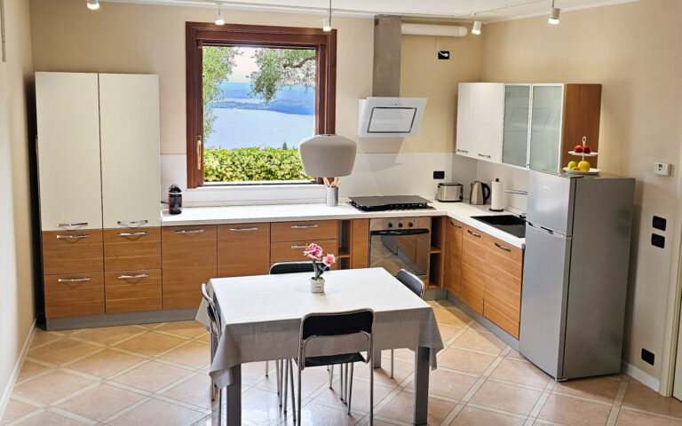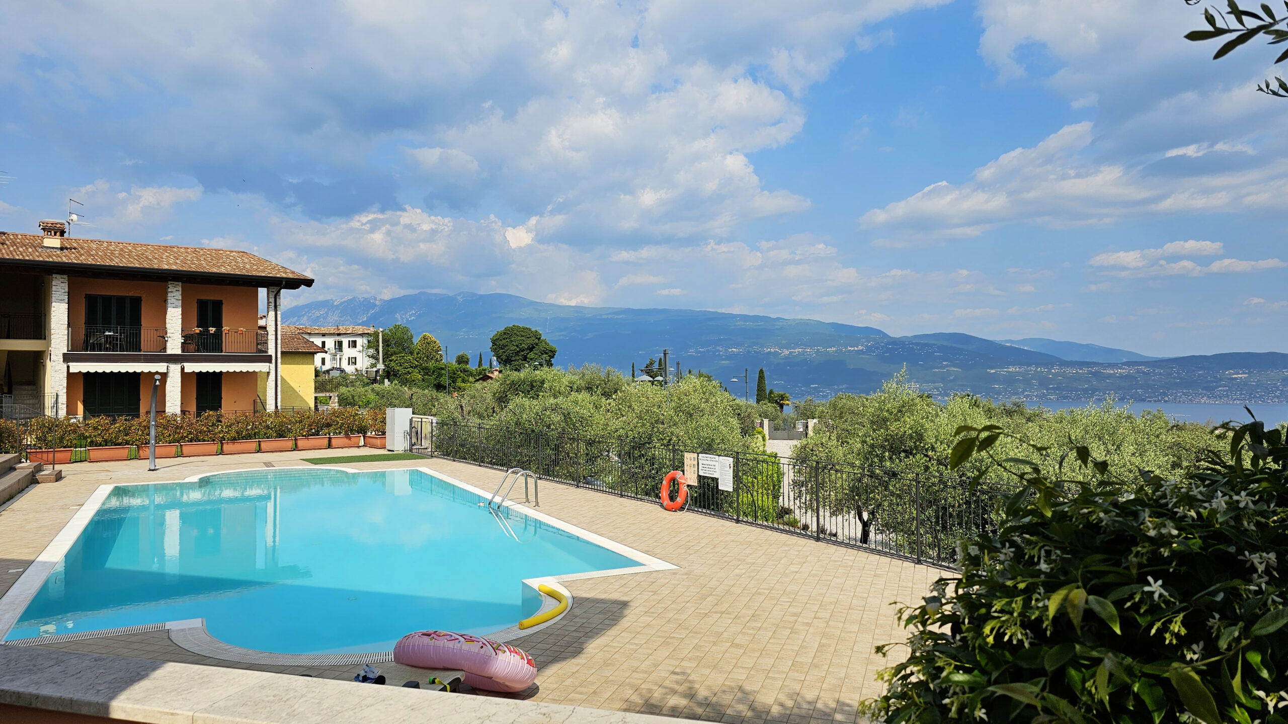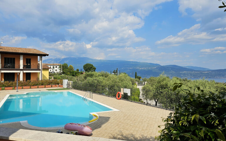 Unsere großzügige, überdachte Terrasse mit Blick auf den Monte Baldo bietet morgens Sonne und nachmittags Schatten. Von hier geht es direkt in den Garten.
