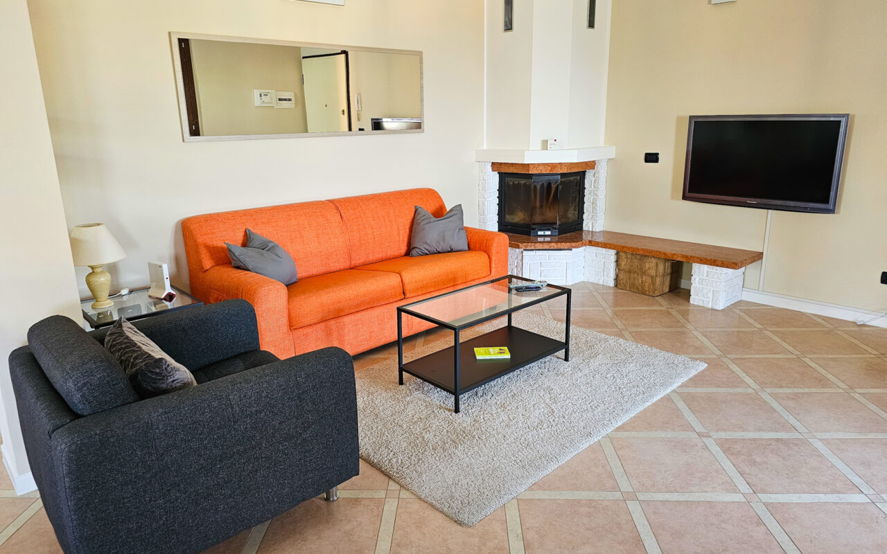 Die klimatisierte 100m²-Wohnung bietet Platz für bis zu 6 Personen, mit zwei Doppelbetten und einer komfortablen Schlafcouch. Die Tische sind erweiterbar für große Mahlzeiten.